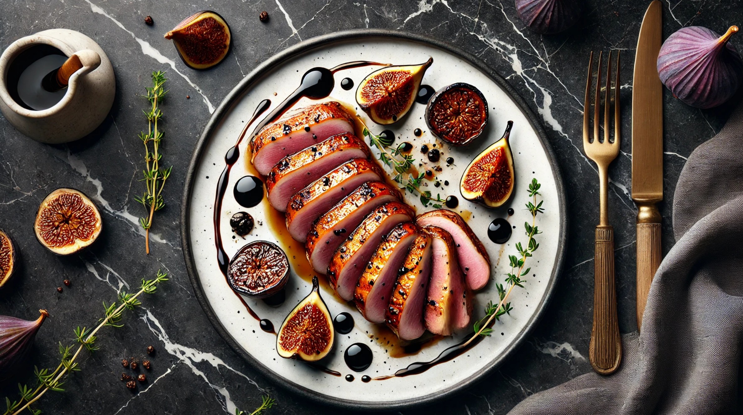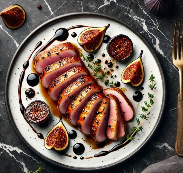 Snijd het vel van de eendenborst kruislings in. Bak op de velkant in een koude pan, langzaam uitbakken tot het vet loskomt (ca. 8 min). Draai om en bak nog 4–5 min. Laat 5 min rusten. Bak de vijgen kort in het achtergebleven vet, voeg honing en balsamico toe, laat karamelliseren. Serveer de eend in plakjes met de vijgensaus.