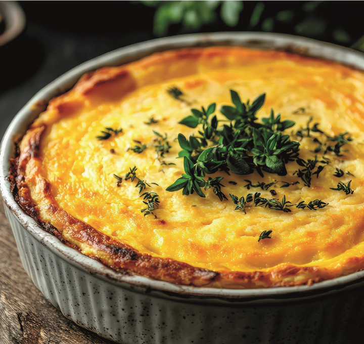 Pureer de maïskorrels samen met de melk, maïzena, zout en cayennepeper tot een gladde massa. Verdeel deze puree over het gehakt in de schaal en strijk de bovenkant glad. Bestrooi het geheel met poedersuiker en bak het geheel 30 tot 35 minuten in een voorverwarmde oven van 200°C totdat het gerecht goudbruin is.